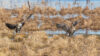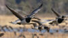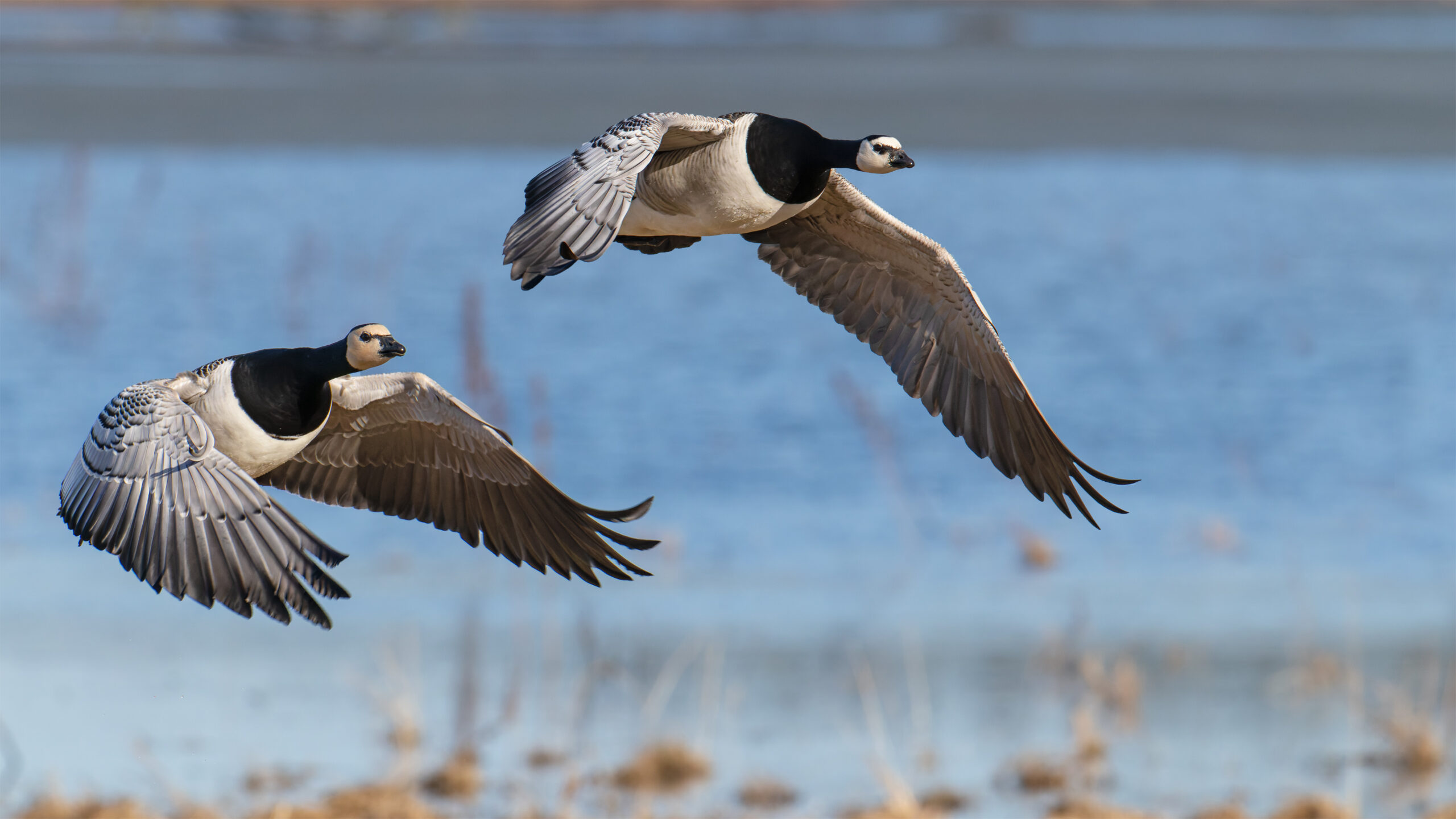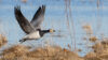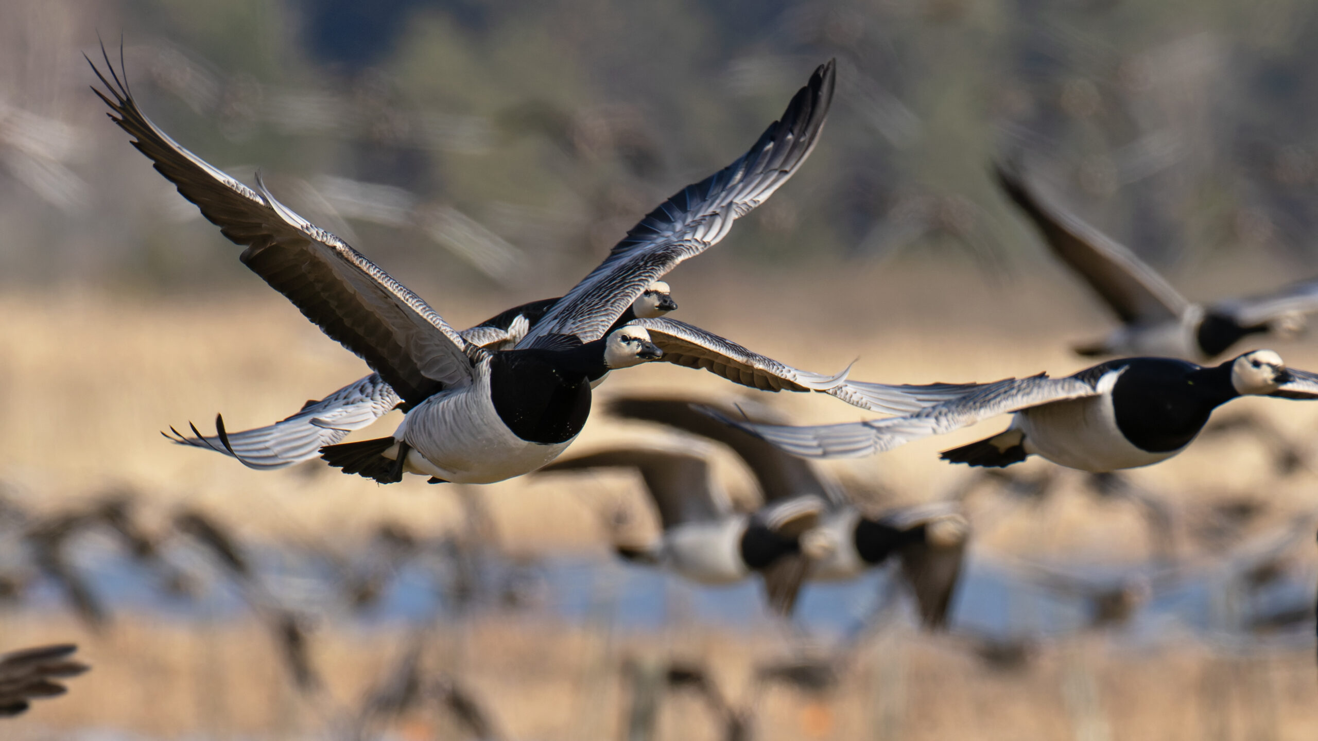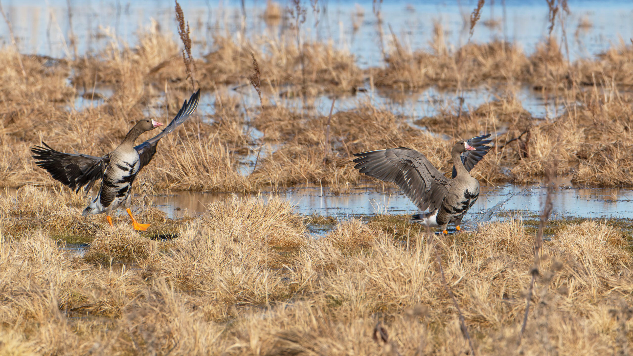 Efter en frukost i gläntan tar jag mig över till vikens västra sida och vandrar stigen som går till fågeltornet. En sånglärkas drill är också ett kärt vårtecken liksom några tofsvipor i spelflykt ovanför strandängarna. Med kikarens hjälp ser jag att viken utanför tornet är isbelagd så jag väljer att stanna mitt på ängarna där många gäss uppehåller sig. Mest bläsgäss men även skogsgäss, grågäss och vitkindade gäss som alla går i större och mindre flockar. Plötsligt är det något som stör dem och alla flockar går till väders samtidigt. Kanske en havsörn? En efter en landar flockarna igen och gässen återgår till att picka i vegetationen efter föda. Det är svårt att fotografiskt återge de maffiga ögonblicken när alla är uppe och flyger samtidigt. De flyger på olika avstånd från mig och bara en liten del av fåglarna som kommer med på bilden hamnar i fokus. Jag koncentrerar mig därför på mindre flockar eller enstaka gäss i mina försök att föreviga upplevelsen.