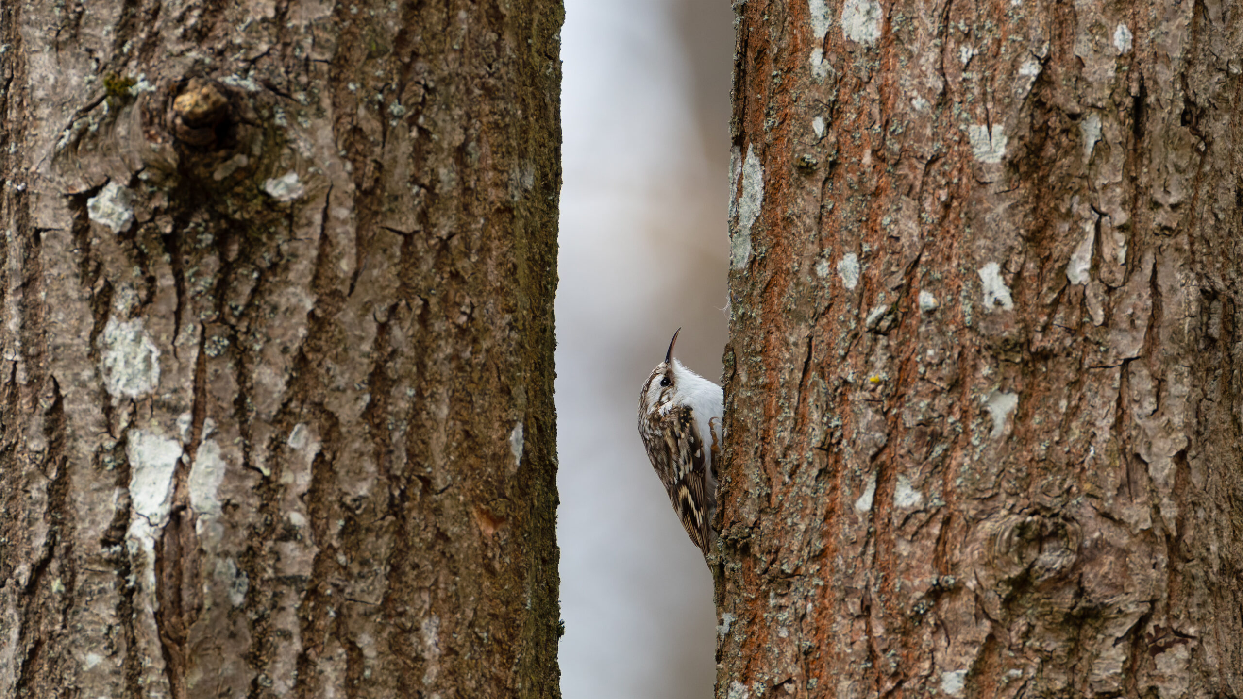Väl på vikens östra strand följer jag den norrut och kommer fram till en glänta med en småfågelmatning. Ställer mig en stund för att se vilka fåglar som fortfarande frekventerar matningen. Inte så många men jag noterar de vanligaste mesarna. Så hör jag en av de mer sparsamt förekommande, stjärtmesen, som brukar beskrivas som en vit dunboll med pepparkornsögon och en lång stjärt. De brukar alltid uppträda i flock men den här gången är det bara två som vid något tillfälle kommer ner till talgbollarna men annars mest sitter djupt inne i en buske. Avvaktar ytterligare en stund och registrerar både tofsmes och grönsiska. Så ser jag en svag skugga som rör sig upp längs stammen på ett av träden. En trädkrypare. Till skillnad från nötväckan, som obehindrat rör sig både upp och nedåt, kan trädkryparen bara krypa uppåt. Därför landar den alltid längst ner på trädet och söker av det, ofta i cirklar runt trädet, efter mat hela vägen upp till toppen. Varefter den flyger ner till roten av nästa träd och där startar om klättringen uppåt.